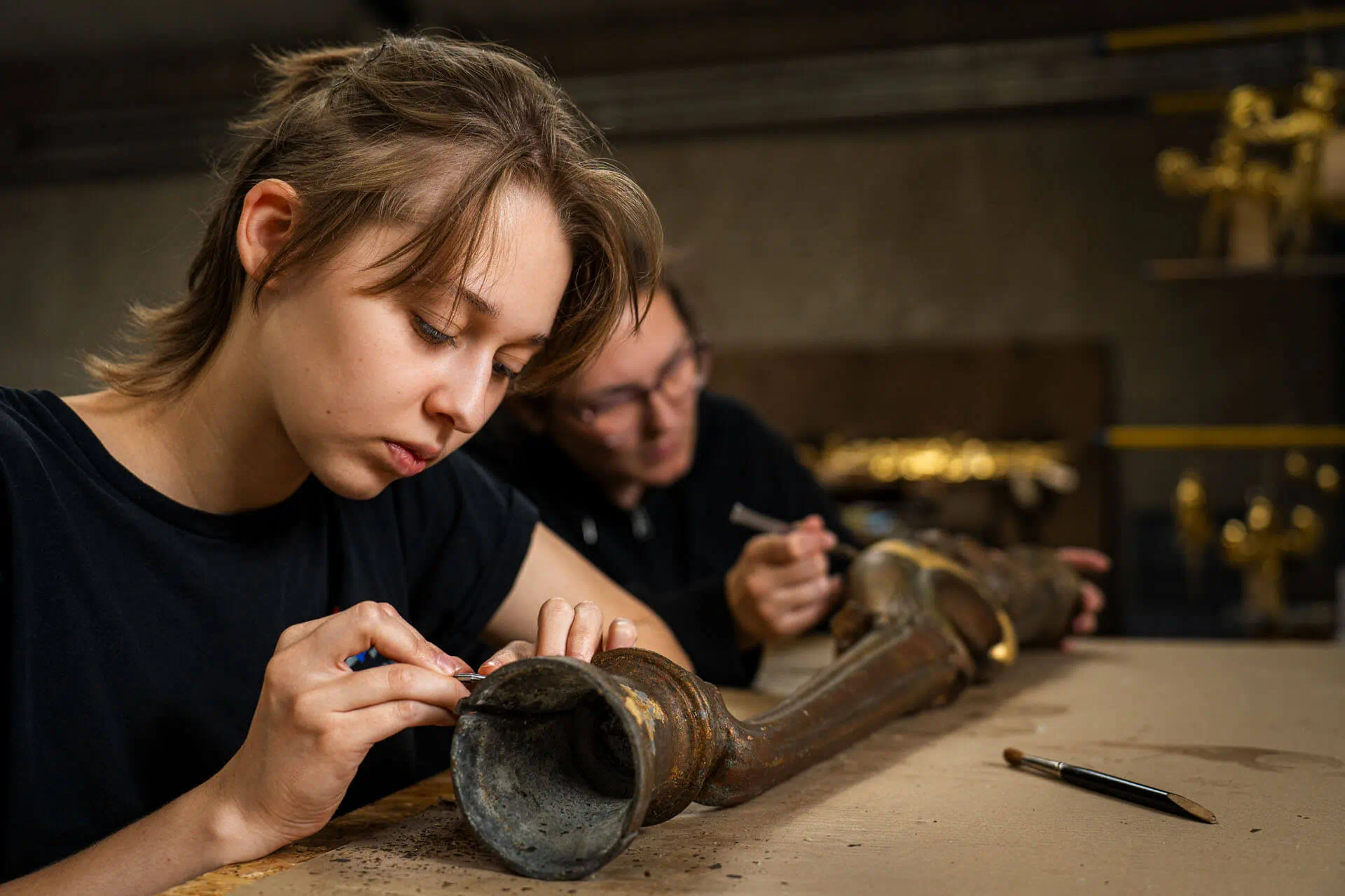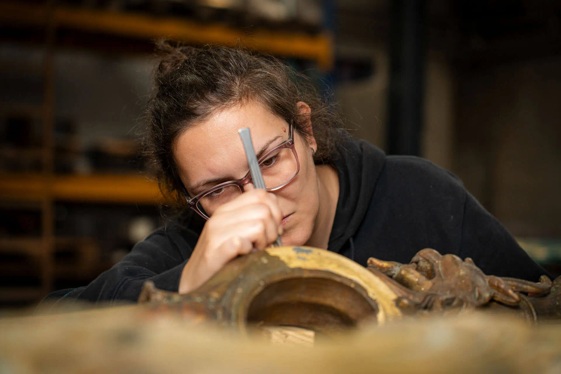 Was auf den ersten Blick nach schwerem Handwerk aussieht, entpuppt sich als hochpräzise Detailarbeit – jede Oberfläche wird studiert, jede Technik an das Objekt angepasst.